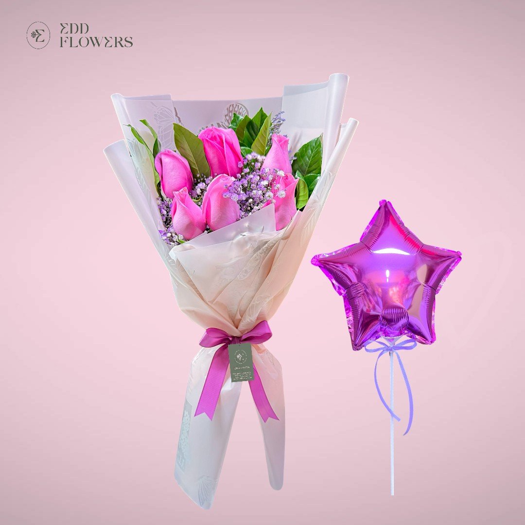 - Ramo de rosas rosadas con flores de estación