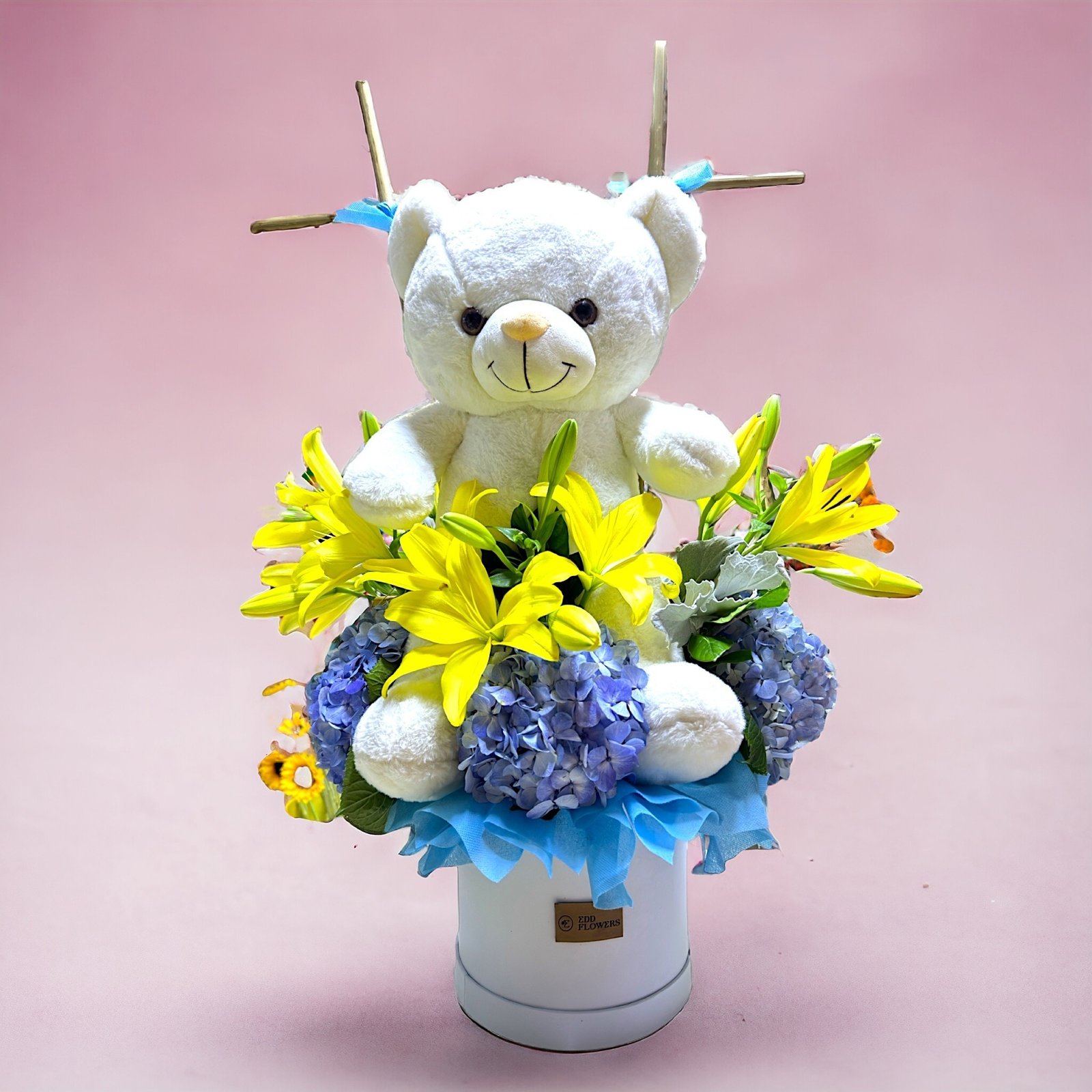 - Acompañado de flores de estación y peluche de 65cm de alto