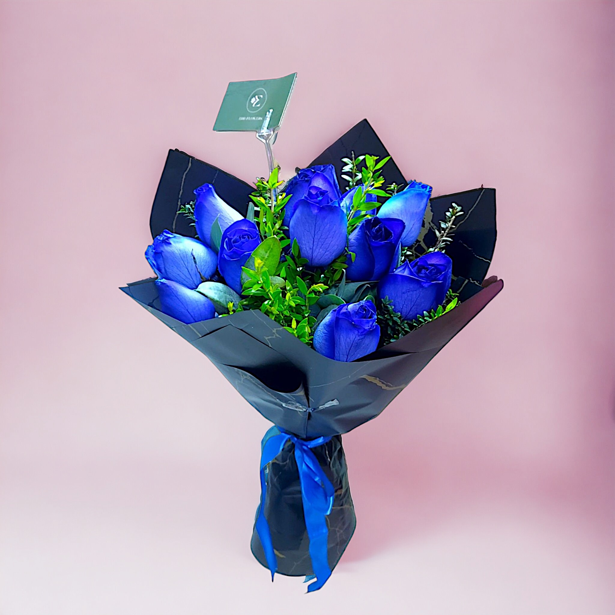 - Ramo de 12 rosas azules con forro negro elegante
