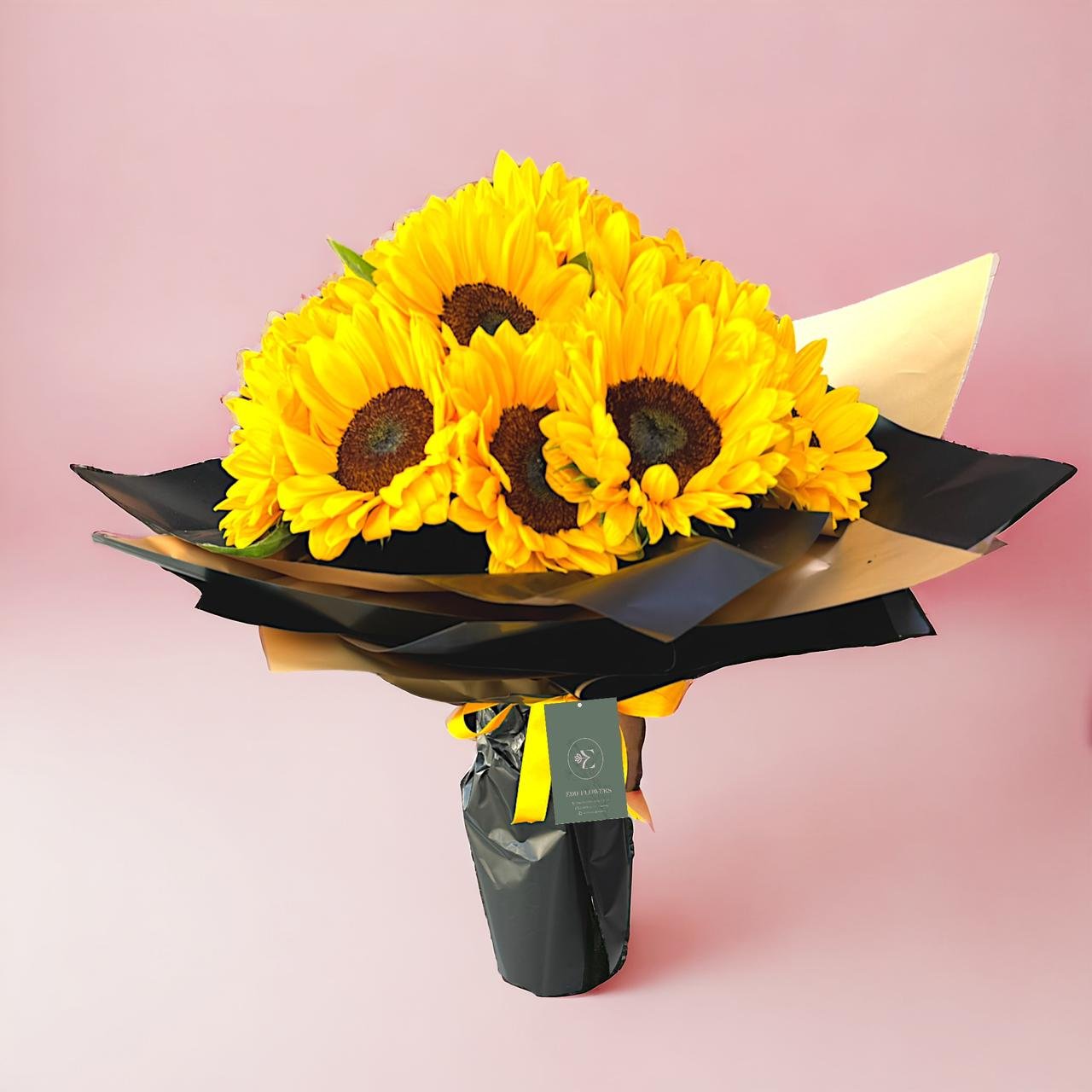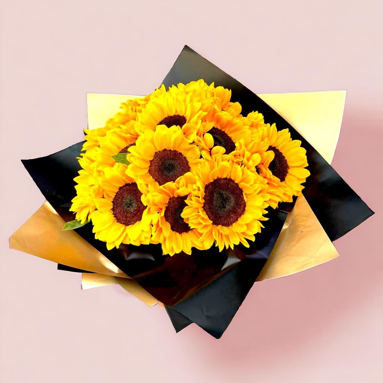• Ramo de 20 girasoles, decorado con papel fino y lazo